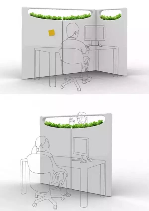 办公室的绿色很稀少,这并不利于健康,尤其是在加班这种心情也不好的时候,在办公桌的隔板上种些草倒还不错,设计师 Jinsun Park 和 Seonkeun Park 就设计了这样一款隔板,隔板的一端有一个储水盒,上端还有引流,可以将水均匀洒在下方,在下方种上绿色植物,应该也用不上空气净化仪了吧。